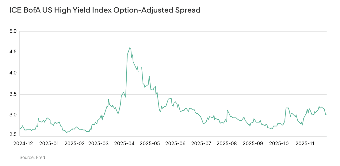 Overall, credit spreads remain tight by historical standards, supported by solid fundamentals and strong demand for yield. Nonetheless, spreads have widened modestly in recent weeks – particularly in high yield and lower-quality credit – amid signs of increased supply and isolated credit concerns. The weakest segment (CCC / deeply speculative) has already shown more pronounced stress, and several idiosyncratic credit events (e.g., First Brands, Tricolor) have further sharpened investor scrutiny across private credit and high yield.