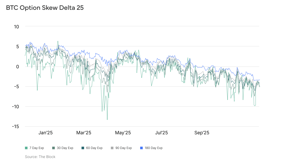 25-delta option skew is trading near its lowest levels across maturities since the tariff-induced sell-off in April, signalling a clear preference for downside hedging over upside participation.